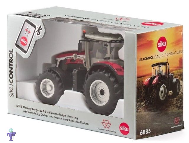 Siku 6885 - Die kostenlose App herunterladen, Bluetooth-Verbindung aktivieren und los geht der Spielspaß. Mit der neuen SIKUCONTROL APP kann der Massey Ferguson 9S 425 mit dem Smartphone und dem Tablet (Android- und iOS-Technologie) gesteuert werden. Alternativ wird der Traktor auch im Set mit dem Fernsteuermodul Bluetooth angeboten. Das SIKUCONTROL-Modell aus Metall und Kunststoff zeichnet sich nicht nur durch die zahlreichen Features aus, sondern auch durch die bei Fans so geschätzte Detailliebe. Alle Funktionen und die fünf Getriebe des Traktors lassen sich über die kostenlose App steuern. Wahlweise über die virtuelle Gamepad-Steuerung oder die Bewegungssensoren der mobilen Geräte. Dieses intuitive Feature ist eine willkommene Abwechslung und bietet zusätzlichen Spielspaß. Mit der App ist präzises Rangieren genauso möglich wie das Steuern der Frontlader, der Anhänger von Joskin und Fortuna oder dem Pflug von Vogel & Noot. Wie beim Fernsteuermodul lassen sich zudem das Fahrlicht an der Motorhaube, die Arbeitsscheinwerfer an der Kabine, die Heckblinker und die Rundumleuchten schalten. Die SIKUCONTROL APP bietet Traktorfans zusätzlich wissenswerte Informationen über Original. Für den Traktor kann zudem ein Name angelegt werden. Die Einstellung und Funktionen der App werden laufend aktualisiert. Mit der OTA(Over-The-Air)-Funktion der App kann die Software im Traktor direkt upgedated werden.